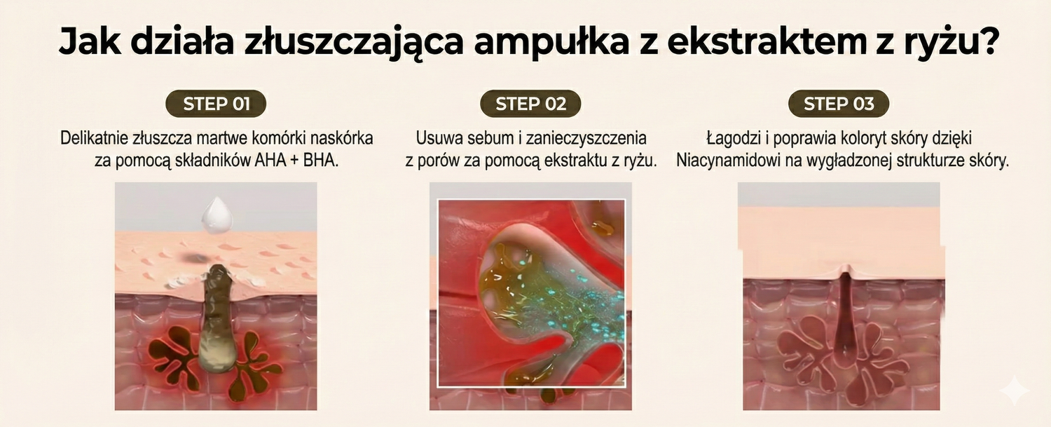 - Usuwa martwy naskórek, nadmiar sebum i zanieczyszczenia